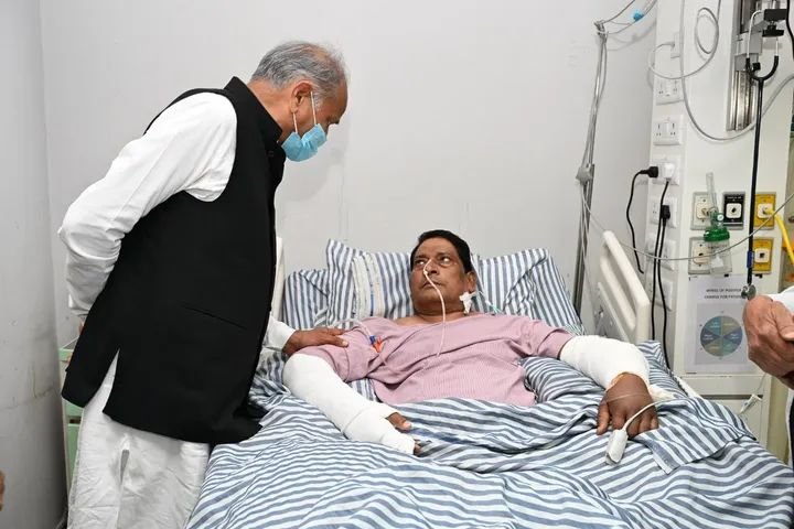 Jaipur में पूर्व मुख्यमंत्री Ashok Gehlot ने सोमवार को Rajasthan Hospital पहुंचकर कांग्रेस नेता Lakhiram Bairwa से मु...